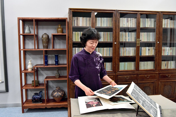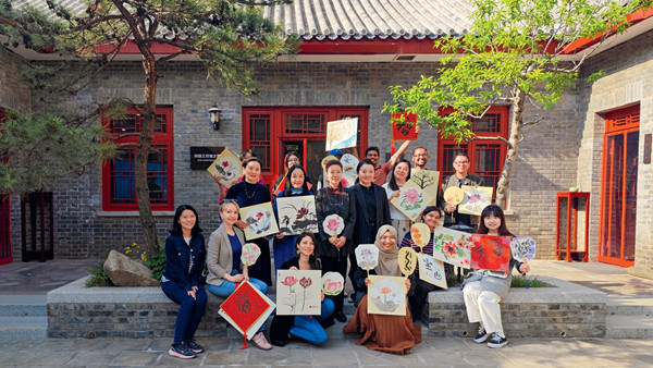 | 来自不同国家的外国教授和专家齐聚北京大学,参加由中国女画家协会与北京大学联合举办的“丹青应色 艺境寻踪”雅集活动,来宾们捧着各自的作品——融合了不同文化元素的扇面、书法和花卉小品,与中国女艺术家拍照留念。摄影 武广宇 |