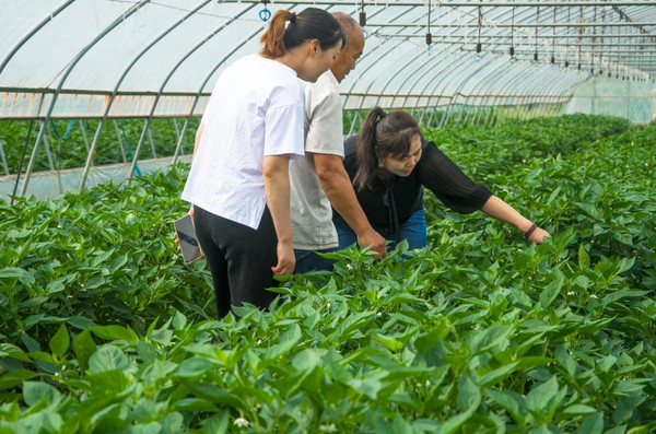 | 周从贵(右一)和村民在蔬菜大棚里。(红安县委宣传部供图) |