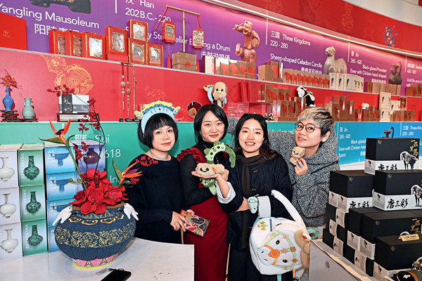 | 国博文创研发团队的设计师于博物馆二层文创体验区合影。(从左至右为高璇、郑依依、郑中允子、刘雅楠) |