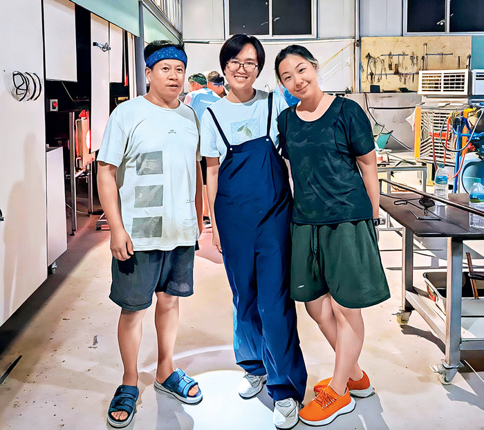 | 2024年8月,李晓欣(左二)在江西景德镇探访青年玻璃艺术家赵瑾雅(右一)。 |