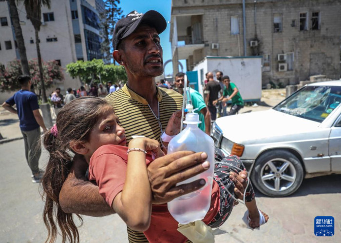 | 2025年7月13日,在加沙城一所医院,一名男子怀抱在以军空袭中受伤的女孩。新华社发(马哈茂德·扎基摄) |