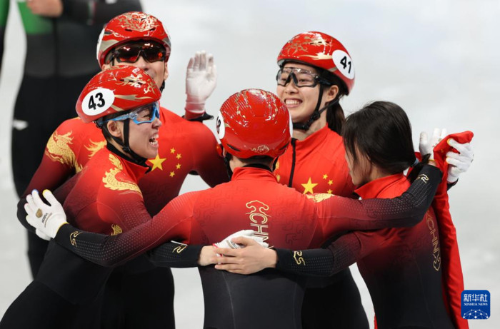 | 2022年2月5日,在首都体育馆举行的北京2022年冬奥会短道速滑项目混合团体接力决赛中,中国队夺得冠军。这是中国队选手在比赛后庆祝。新华社记者 杨磊 摄 |