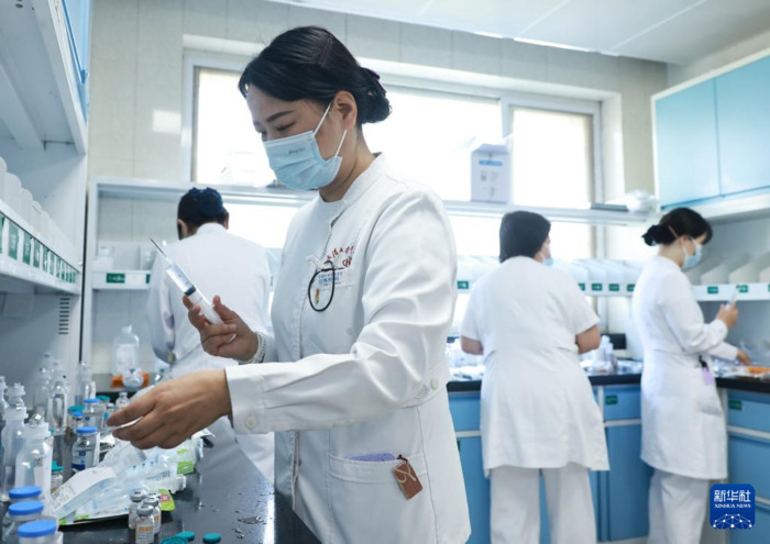 | 2025年5月12日,武汉大学中南医院胸外科护士为患者输液做准备。新华社发(赵军摄) |
