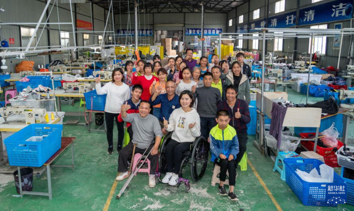 | 2020年10月13日,在湖南省邵阳市城步县湖南七七科技股份有限公司生产车间,杨淑亭(前排中)与工友合影。新华社记者 才扬 摄 |
