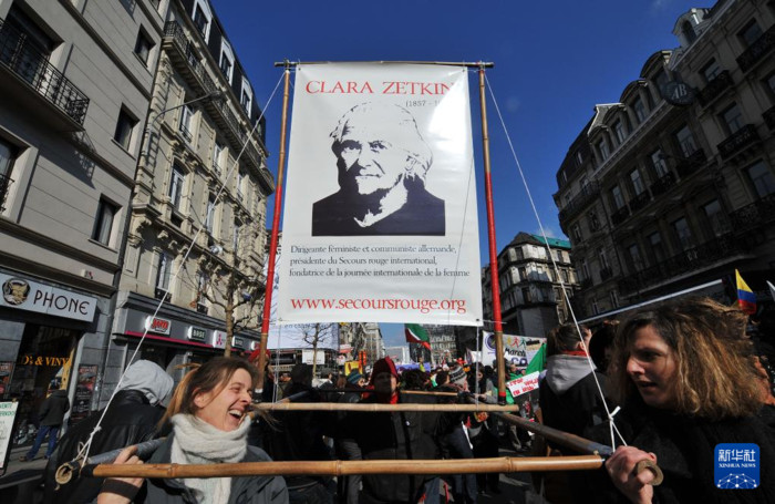 | 2010年3月6日,在比利时首都布鲁塞尔,妇女代表抬着著名女政治活动家、三八国际妇女节的倡导者克拉拉·蔡特金的画像参加庆祝三八国际劳动妇女节游行。新华社记者 武巍 摄 |