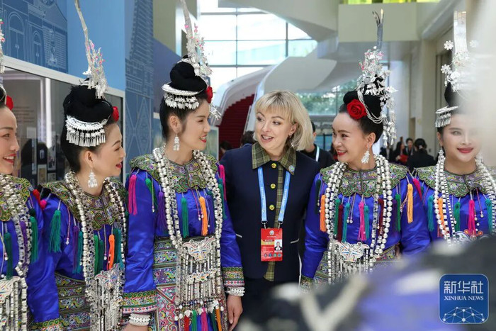 10月14日,来自白俄罗斯的嘉宾在展览现场与侗族大歌表演者们交流。 |