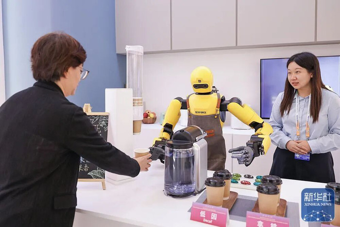10月14日,参观者在展览上体验机器人制作咖啡。 |