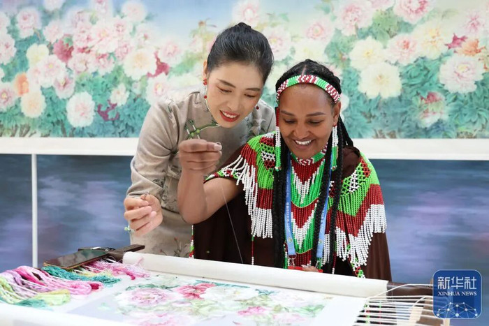 10月14日,来自埃塞俄比亚的嘉宾在展览现场体验刺绣。 |