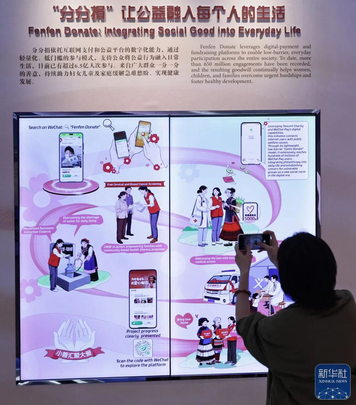 10月14日,全球妇女峰会参会嘉宾在展览上用手机拍摄公益项目展板。 |