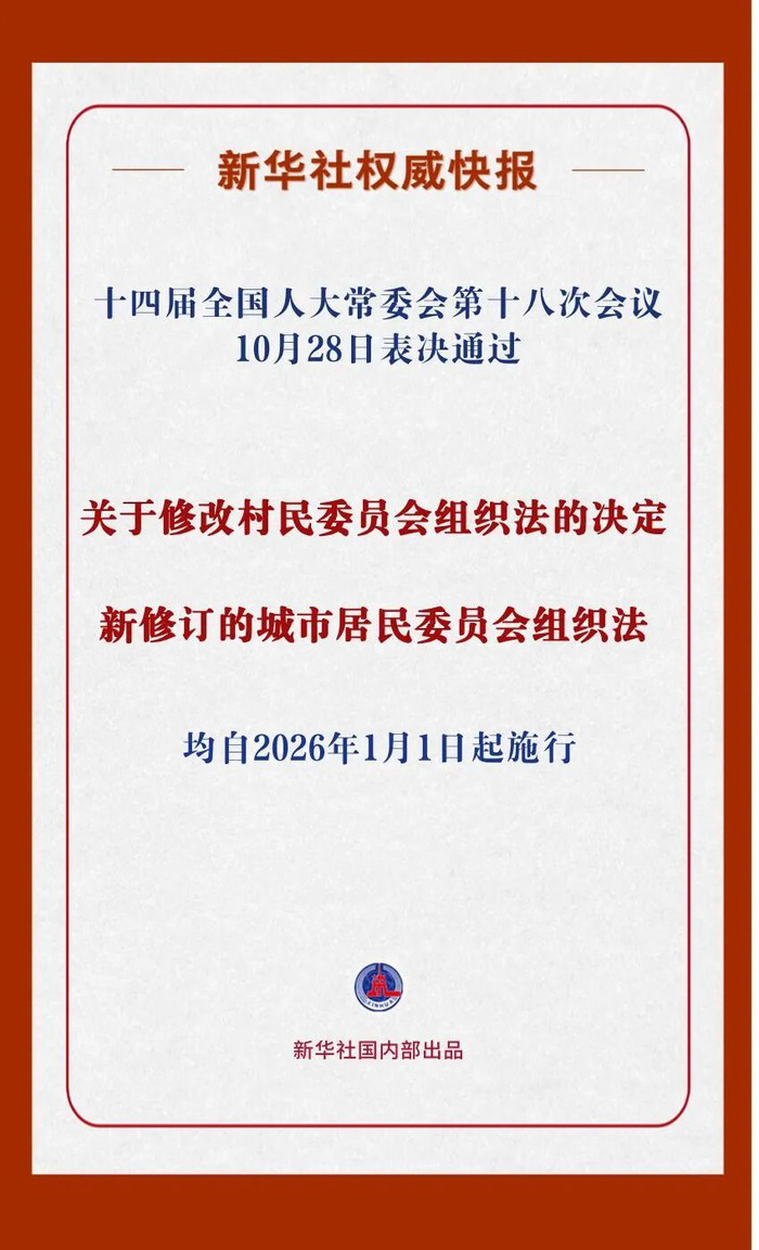 10月28日,十四届全国人大常委会第十八次会议分别表决通过关于修改村民委员会组织法的决定和新修订的城市居民委员会组织法,均自2026年1月1日起施行。