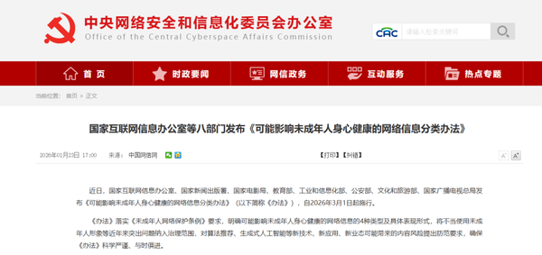 近日,国家互联网信息办公室、国家新闻出版署、国家电影局、教育部、工业和信息化部、公安部、文化和旅游部、国家广播电视总局发布《可能影响未成年人身心健康的网络信息分类办法》(以下简称《办法》),自2026年3月1日起施行。
