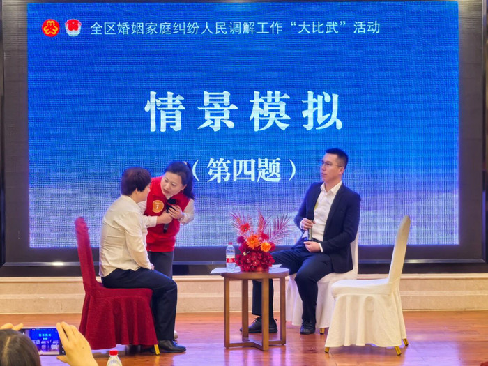 最让人眼前一亮的当数情景模拟题环节。每队选出一名选手,与其他参赛队的选手互相配合,现场开展纠纷调解。扮演“夫妻”的演员们演技精湛,一会儿因家务分工争吵不休,一会儿因孩子教育问题互相指责,将婚姻家庭中的矛盾展现得淋漓尽致。而参赛选手则迅速进入“调解员”角色,一边耐心倾听“夫妻”的诉求,一边温和地安抚他们的情绪,还能精准抓住矛盾焦点,用专业的调解技巧引导双方换位思考。