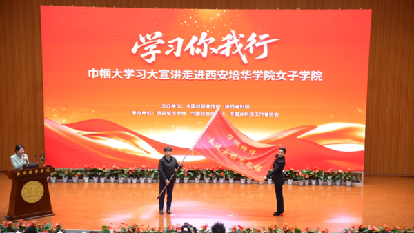 在“巾帼榜样走进女校思政课”接力传旗仪式上,西安培华学院向河北女子职业技术学院接力传旗,让榜样力量薪火相传,让思政之花绽放校园。
