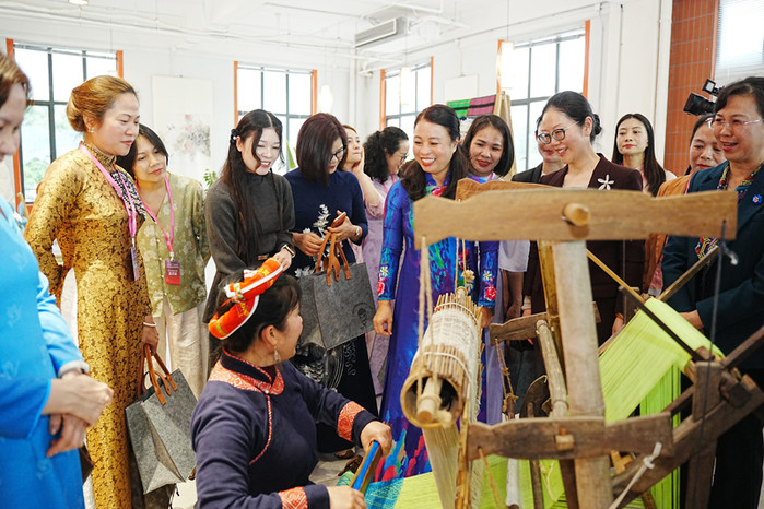 活动现场,中越两国女企业家代表共同达成经贸合作意向,合作领域涵盖人工智能跨境电商、跨境供应链等重点方向。随后,双方代表一同前往友谊关中外文明交流中心,沉浸式体验中国非遗壮锦手工艺制作。中越姐妹们围坐一堂、促膝交谈、携手创作,在互动交流中加深了解、增进情谊。在中国—东盟特色小集市上,充满广西风味与越南特色的小吃琳琅满目,大家相互分享制作技艺、共品地道美食,在文化交融中传递相知相亲、守望相助的温暖力量。