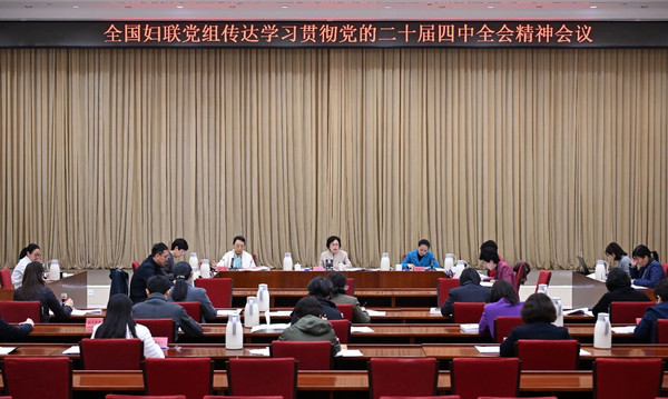 10月24日,全国妇联党组召开会议,传达学习习近平总书记重要讲话和党的二十届四中全会精神,部署贯彻落实工作。全国妇联党组书记、副主席、书记处第一书记黄晓薇主持会议并讲话,强调要把学习宣传贯彻习近平总书记重要讲话精神和全会精神作为当前和今后一个时期的重大政治任务,深刻领悟“两个确立”的决定性意义,增强“四个意识”、坚定“四个自信”、做到“两个维护”,团结引领广大妇女坚定不移听党话、跟党走,为续写经济快速发展和社会长期稳定两大奇迹新篇章、开创中国式现代化建设新局面,更好发挥“半边天”作用。