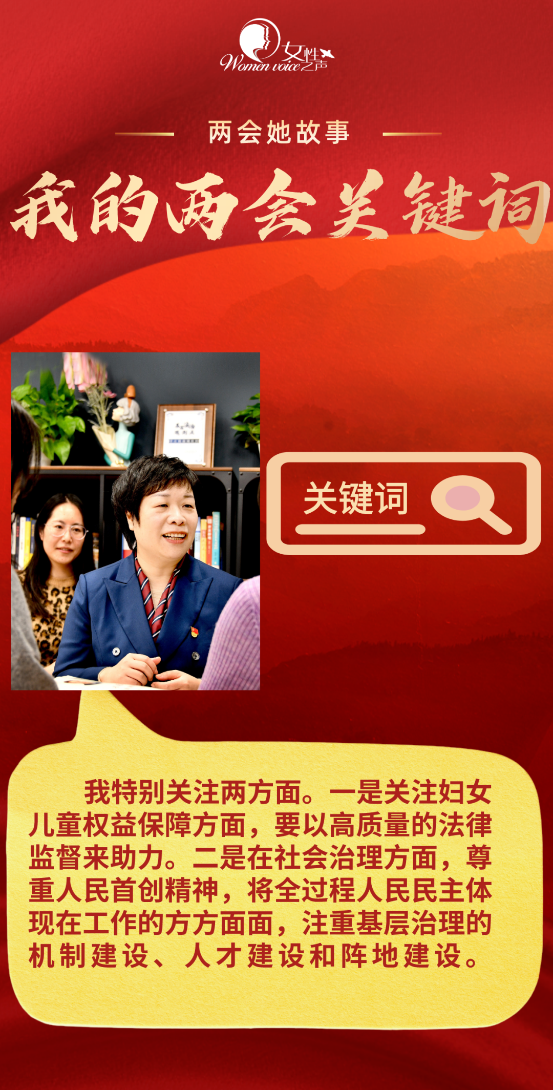 她们是扎根基层、为民“发声”的“小巷总理”,她们是坚守乡土、潜心育人的乡村教育“引路人”,她们是不懈奋斗、勇攀高峰的女科技工作者……她们来自各行各业,她们的身影正活跃在全国两会的会场上:聚焦发展大计、心系民生冷暖,回应社会关切,推动社会进步……全国两会召开之际,全国妇联女性之声与地方妇联新媒体联合推出专栏《两会她故事》,展现新时代两会女代表女委员履职尽责、担当作为的巾帼风采。