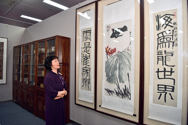 | 来自不同国家的外国教授和专家齐聚北京大学,参加由中国女画家协会与北京大学联合举办的“丹青应色 艺境寻踪”雅集活动,来宾们捧着各自的作品——融合了不同文化元素的扇面、书法和花卉小品,与中国女艺术家拍照留念。摄影 武广宇 |