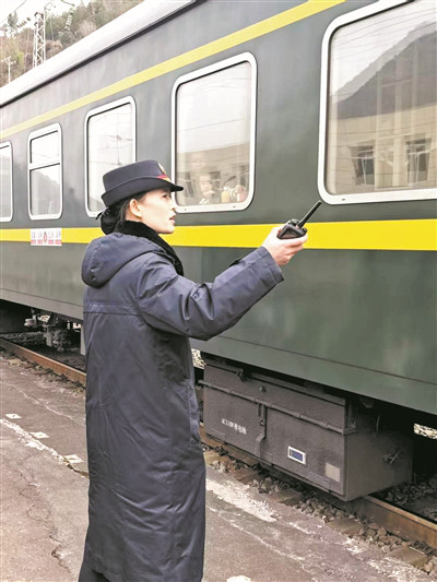 | 黄瑶正在列车旁指挥旅客上下车。高舒帆 摄 |