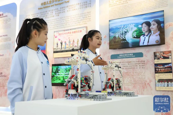 10月14日,参与春蕾科技项目的学生李沁函、马星艳(右)在展览现场展示她们的科技作品“魔方机器人”。 |