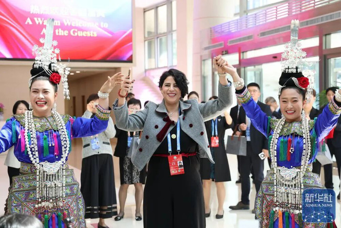 10月14日,来自阿尔及利亚的嘉宾在展览上与侗族大歌表演者们一起载歌载舞。 |