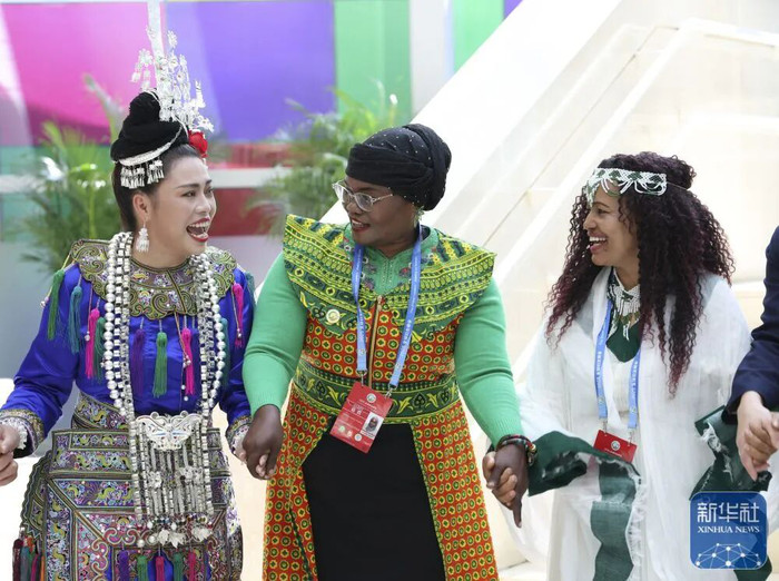10月14日,来自坦桑尼亚和埃塞俄比亚的嘉宾在展览现场上与侗族大歌表演者们一起载歌载舞。 |