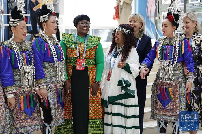 10月14日,来自坦桑尼亚等国的嘉宾在展览上与侗族大歌表演者互动。 |