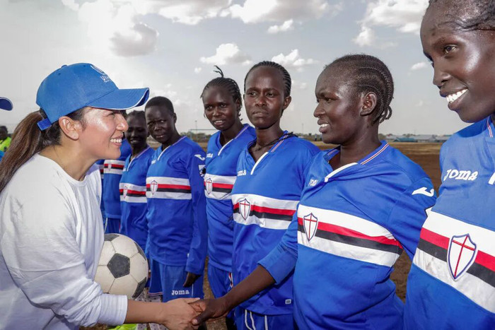 2024年2月21日,联合国难民署亲善大使、奥运冠军杨扬(左前)与卡库马难民营女子足球队队员交流。新华社发(联合国难民署供图) |