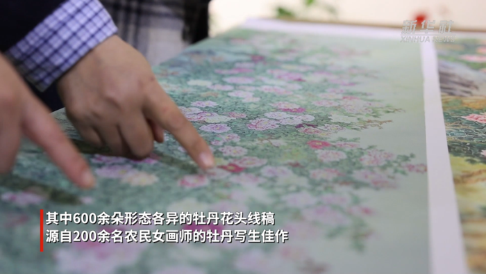 画卷以澄澈天青为底色,巧妙融合工笔写实的细腻与水墨写意的灵动,完整呈现菏泽牡丹9大色系、10大花型。其中600余朵形态各异的牡丹花头线稿,源自200余名农民女画师的牡丹写生佳作。