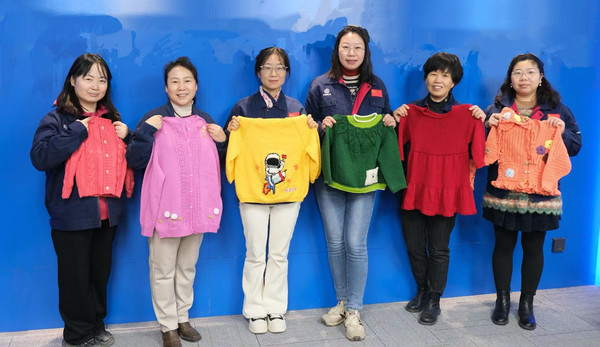 | 航天四院女职工为孩子们编织带有“航天特色”的毛衣。 |
