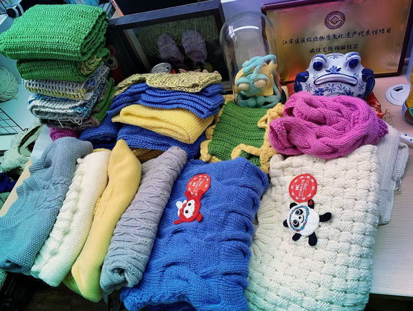 武汉毛线钩编非遗项目第三代传承人凃洁的参与,让非遗技艺在公益中焕发新生。2021年深秋,湖北省妇联邀约涂洁参与“恒爱行动”,将非遗传统文化与公益慈善融合,让传统技艺有了鲜活的有情感的应用场景:从最基础的“元宝针”,加上武汉钩编的标志性技法“梅花扣”,最后织成“两头一插”的老式围巾,取名“小时候”,寓意着让老手艺裹着童年的暖。凃洁的徒弟还把现代卡通元素融进传统技法里,织成的“小熊抱竹”毛衣,深受孩子们喜爱。
