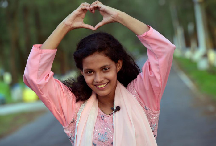 | 2023年5月26日,在孟加拉国首都达卡,阿里法·沁做出爱心手势表达对中国的爱意。新华社发 |