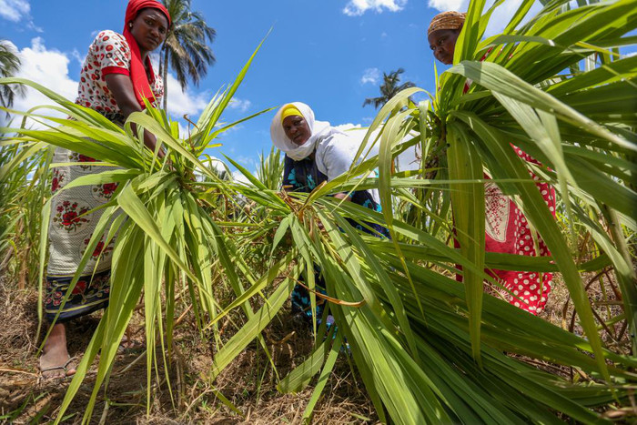 | 9月20日,在坦桑尼亚桑给巴尔,塔希娅·包索·马萨韦(中)与同伴采收菌草。(埃马纽埃尔·赫尔曼 摄) |