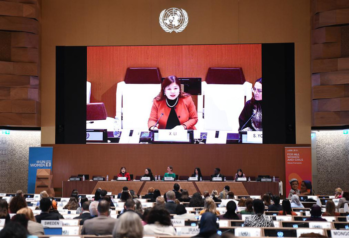 | 3月7日,在瑞士日内瓦万国宫,中国代表在联合国国际劳动妇女节纪念活动暨北京世界妇女大会三十周年对话会上讲话。新华社记者 连漪 摄 |