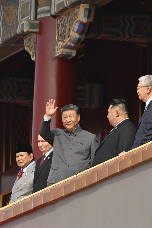 2025年9月3日,纪念中国人民抗日战争暨世界反法西斯战争胜利80周年大会在北京天安门广场隆重举行。这是中共中央总书记、国家主席、中央军委主席习近平等在天安门城楼上。 新华社记者 岳月伟 摄 |