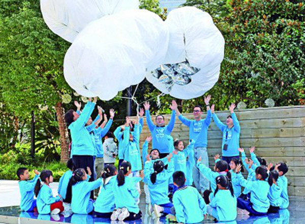 | 在上海浦东美术馆,孩子们与设计师团队共同打造并升起“气候云”艺术装置。新华社发 |