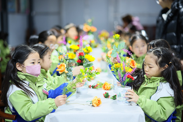 在北京传统插花博物馆里,女童们跟随非遗传承人,开启一场中华传统花艺的沉浸式探寻之旅。她们通过参观传统插花博物馆与非遗技艺传承馆,系统了解中国三千年插花历史以及剪纸、蓝染等多项非物质文化遗产。在实践环节,孩子们手持修枝剪,修剪枝桠、整理叶片,依着传统构图,打造出人生第一束插花作品;在香囊制作体验中,孩子们将薰衣草、薄荷等干花填入素布囊,指尖萦绕着草木的清芬,每一次装填都满含对自然与传统的敬畏。