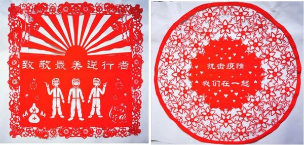 | 天台陈娅红:剪纸《致敬最美逆行者》(左)《抗击疫情 我们在一起》(右) |