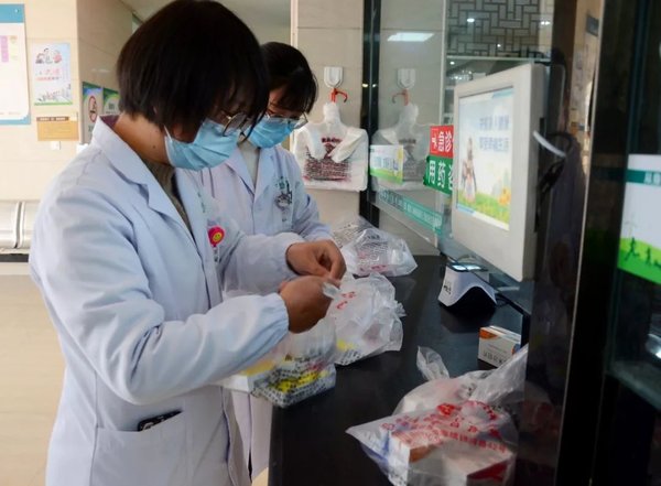 | “白衣骑士”在药房为慢性病患者拿药,进行分袋包装。 |