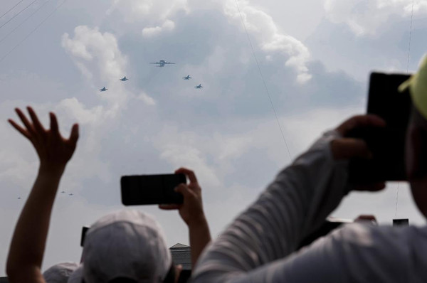 战鹰呼啸,振翅长空,空中梯队依次低空飞过天安门广场。