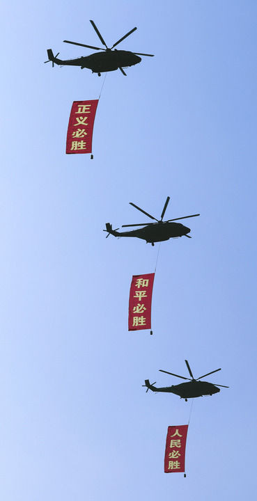 | 2025年9月3日,纪念中国人民抗日战争暨世界反法西斯战争胜利80周年大会在北京隆重举行。这是空中护旗梯队通过天安门广场,3架直-8L运输直升机分别悬挂“正义必胜”“和平必胜”“人民必胜”条幅。新华社记者 李钢 摄 |
