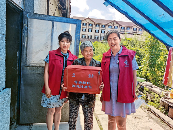 | 王荣香(左一)为辖区老人送母亲邮包。 |